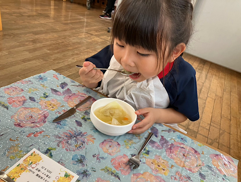 マナー教室の日 2025.09.25 2025年度 Blog 食育 キンダー1組さん達は、今年度初めてのマナー教室でした。 とっても美味しそうなメニュー。 みんなとっても上手にいただけましたね。 ふわふわ団子作ったよ 前の記事 運動会(Baby,Angelクラス) 次の記事