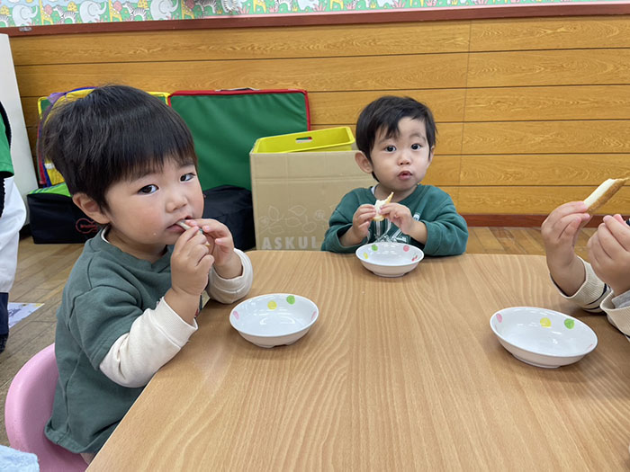 ベビー2・3クラスのおやつ 2025.11.27 2025年度 Blog ベビー2・3クラスのかみかみおやつの様子です。 今回は焼いたパンをかみかみして食べました! おいしくかみかみできましたね♪ ミドルクラスのクッキー作り 前の記事