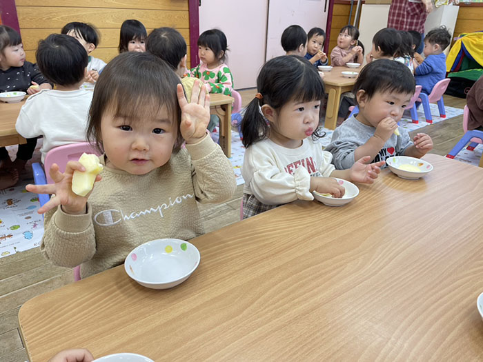 ベビーB2、3クラスがかみかみおやつでりんごを食べました。