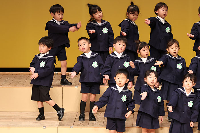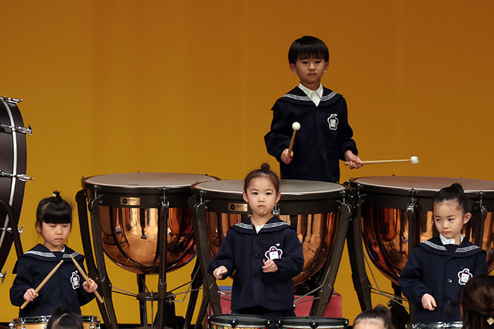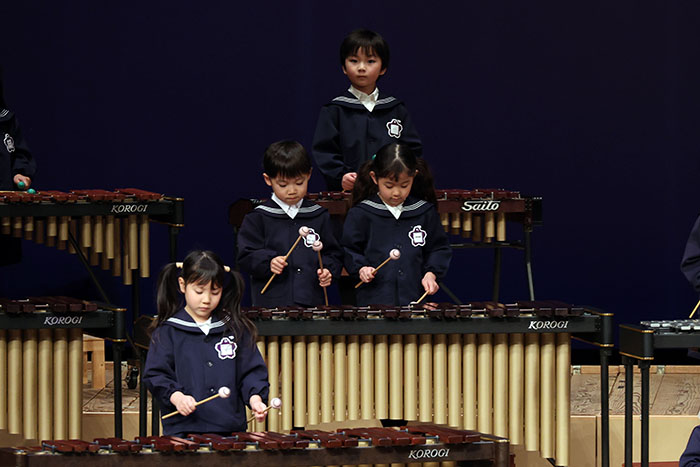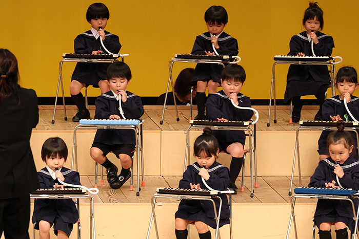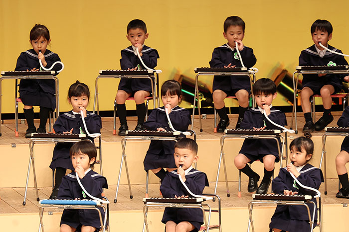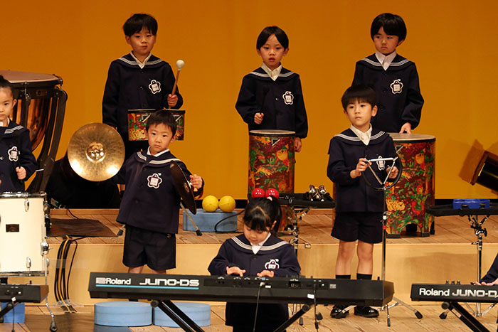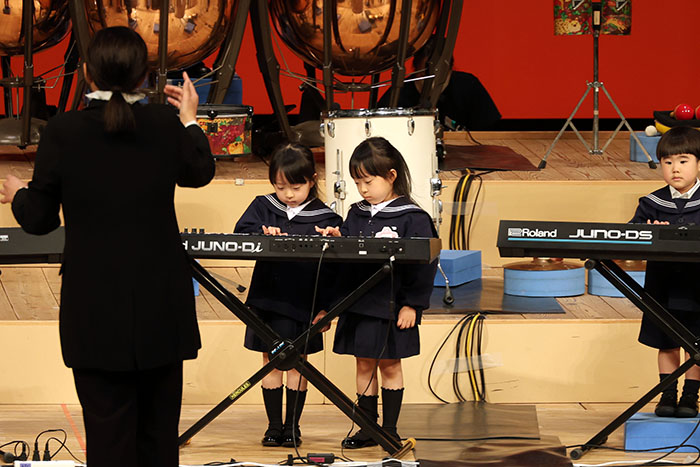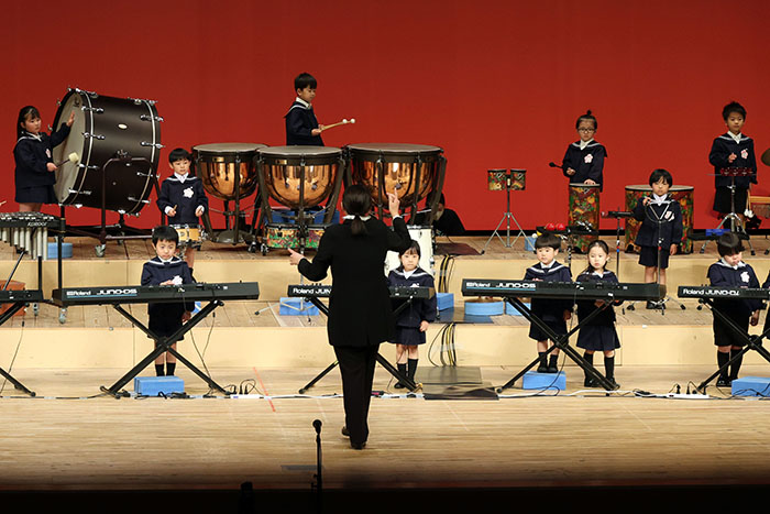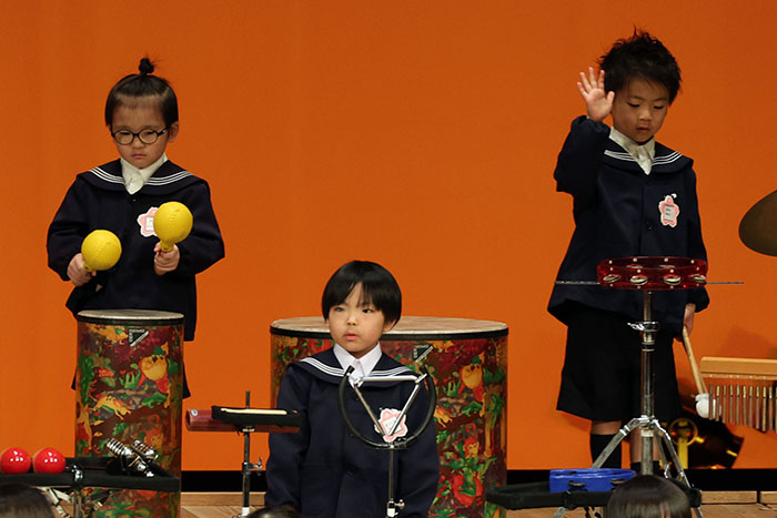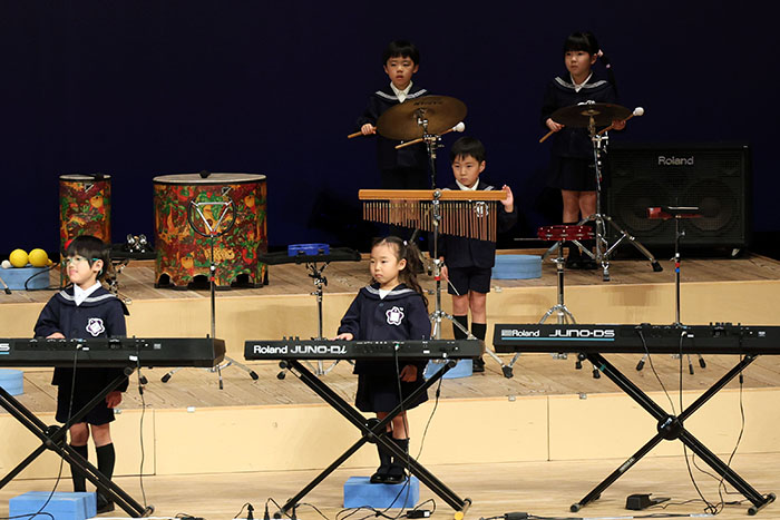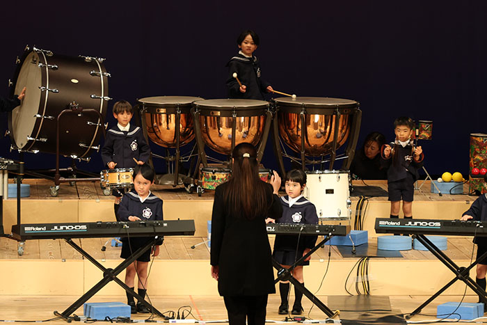 ライブオンステージ 2025(器楽合奏・合唱) 2026.01.28 2025年度 Blog 年間行事 今年も見応えのある素晴らしいライブオンステージでした。 キンダークラスは、自分達で選んだ楽器を一生懸命練習しました。 目を瞑って聴くと、とても園児が演奏しているとは思えない素晴らしい演奏をしてくれました。 ミドルクラスも初めて楽器を使い、上手に合奏ができるようになりました。 ジュニアクラスは一生懸命覚えたキラキラ星等をピアニカで演奏できました。 お歌はみんな綺麗な声で音域広く、上手に歌うことができましたね。 子どもたちの一生懸命な歌声には毎年本当に感動的します。 遊戯では、こだわりの衣装に身を包んだ子ども達が息のあった演技をしてくれました。 男の子の力強い演技、可憐な女の子。 キンダークラスの子ども達は、園最後のステージを華やかに彩りました。 ミドルクラスさんもジュニアクラスさんも、とても上手に一生懸命がんばりましたね! エンジェルさんは衣装を着て立っているだけで可愛いですが、本当に上手にできました。 みんないっぱい褒めてもらったと思います。 第一部:器楽合奏、第二部:合唱の様子です。 かみかみおやつ♪ 前の記事 ライブオンステージ 2025(遊戯) 次の記事