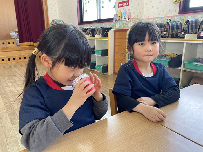 匂い当てクイズ 2026.02.02 2025年度 Blog 食育 Kクラスが食育で匂い当てゲームをしました。 今回は赤がみそ、青はわさび、黄色はコーヒー、緑は納豆、桃はポテトチップにしました! 「いい匂い!」「臭いかも・・・」などと、どのグループも真剣に話し合って正解を考えていました。 ライブオンステージ 2025(遊戯) 前の記事 大根とブロッコリーの収穫 次の記事