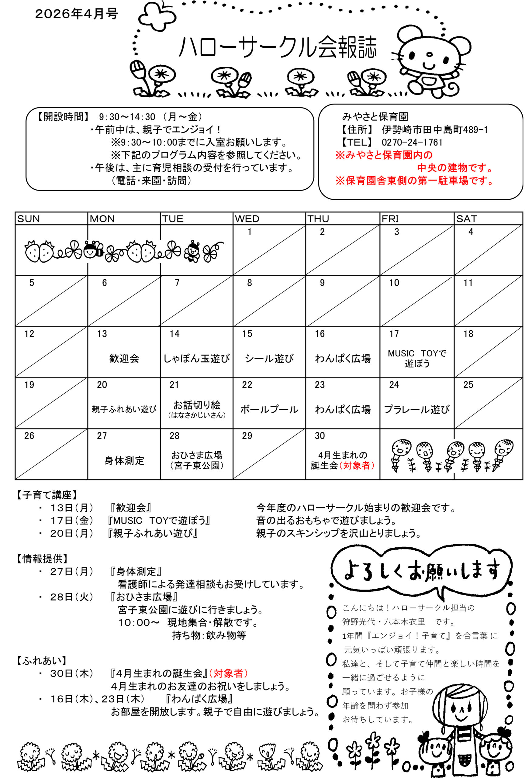 ハローサークル4月号のお知らせ 2026.04.02 子育て支援「ハローサークル」会報誌 2026年4月号を掲載いたしました。 ぜひご覧の上、ご利用ください。 子育て支援ページ Post Share LINE note この記事のタイトルとURLをコピーする 在園児の保護者の方へ:ライブオンステージ2025 写真販売について 前の記事